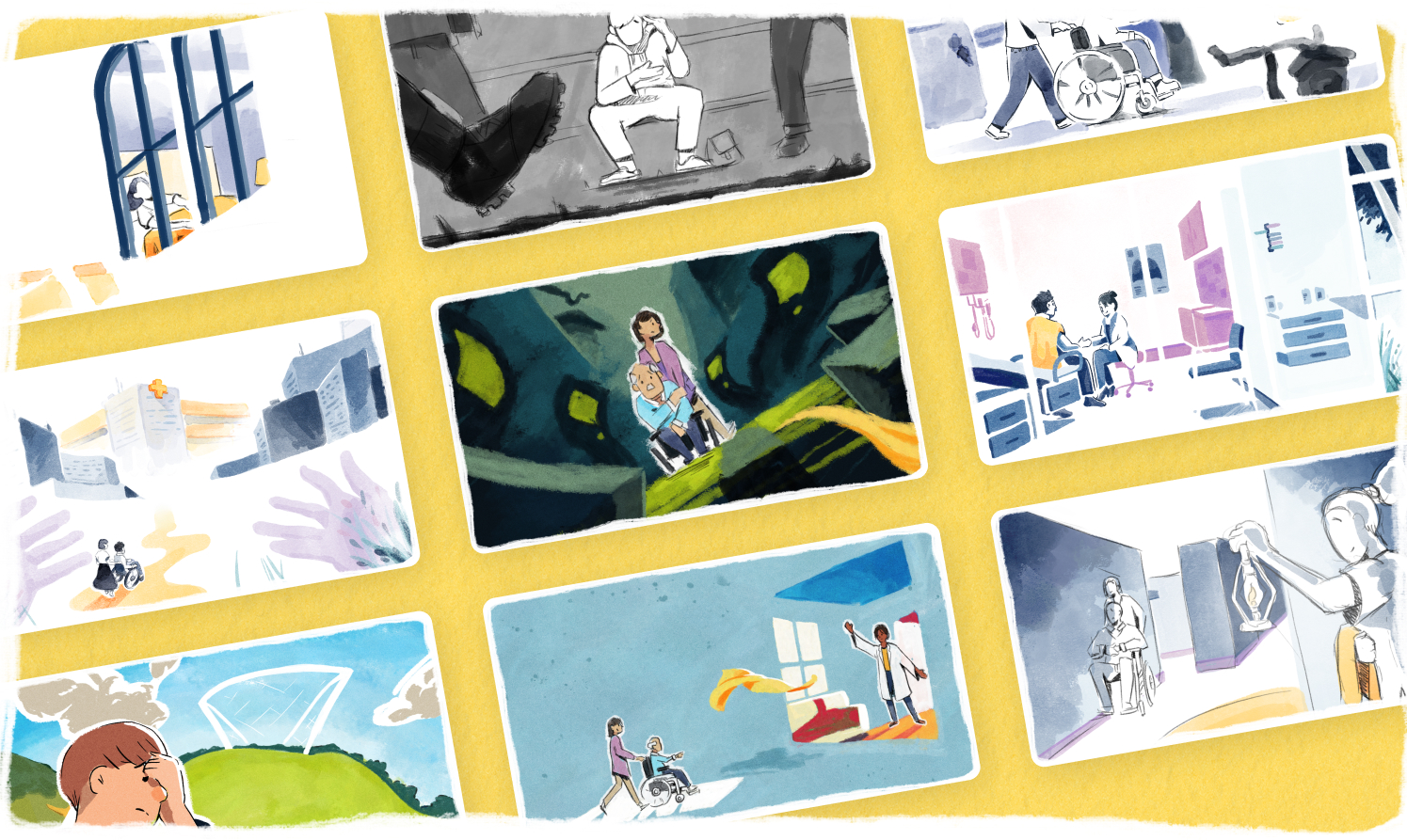 Working together with a strong team at By the Booth, I was tasked with creating the design direction, character designs, and storyboard for the video. To emphasize all the layers of support in their multidisciplinarary holistic care approach, I refined a watercolour based visual direction that allowed the main story elements to shine. The storybook-like qualities captured the patient's point of view and guided the viewers attention as they navigated through the healthcare maze.