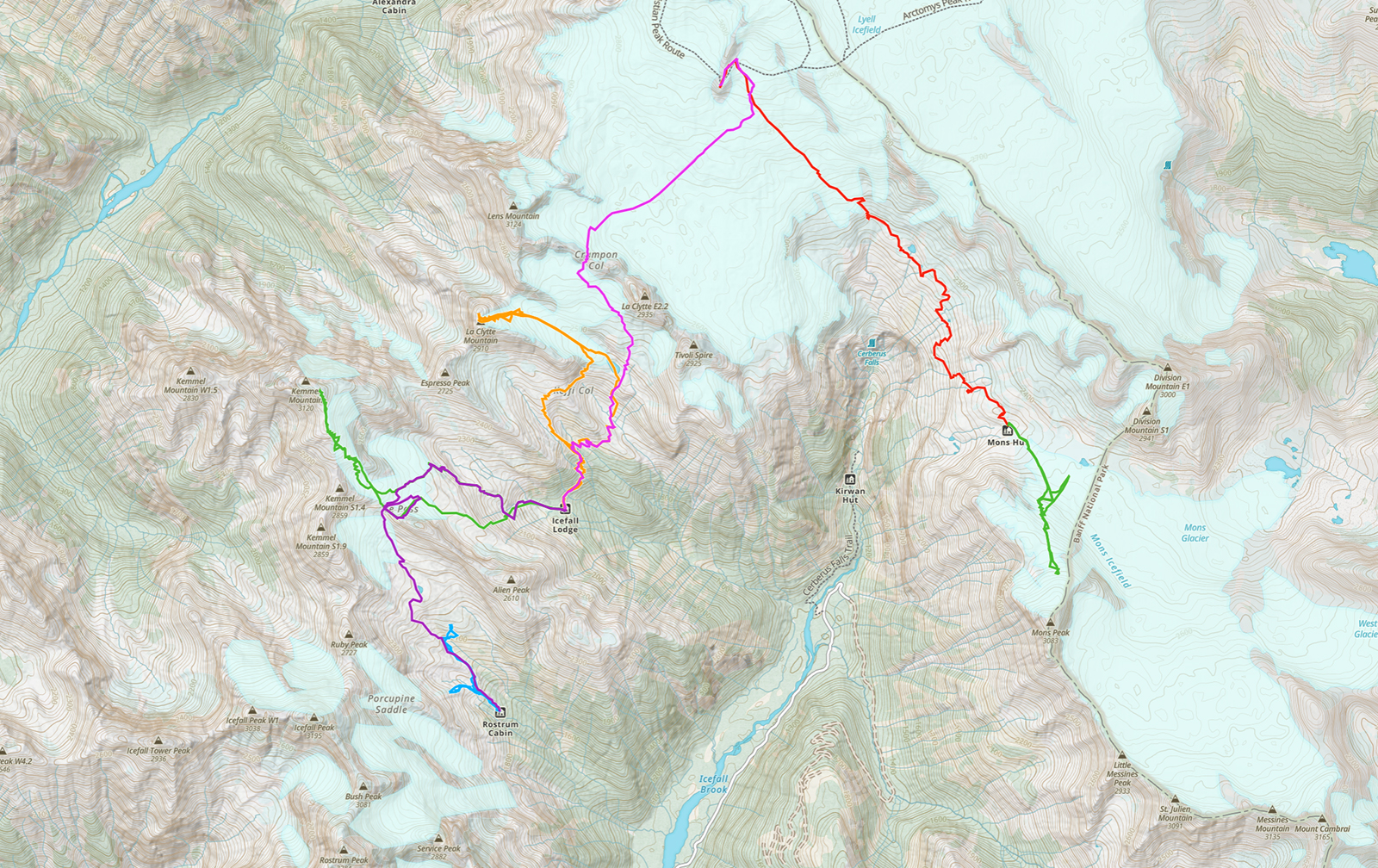 After days of being completely spoiled by our light daypacks, I reluctantly jammed all my gear back into my Descensionist and waddled over to the lodge. We handled our sandwich prep for the next couple of days before being treated to a feast; crêpes with flambéed bananas and a blueberry reduction, plus a filling omelet and bacon. Bellies full and bags heavy, we geared up and set our sights back on Ice Pass to start the trek toward Rostrum Hut.