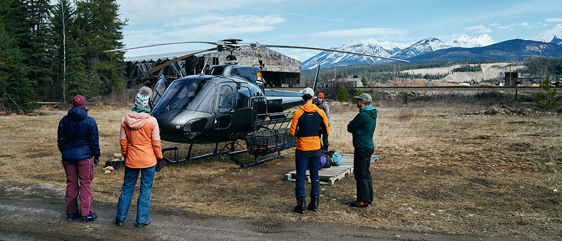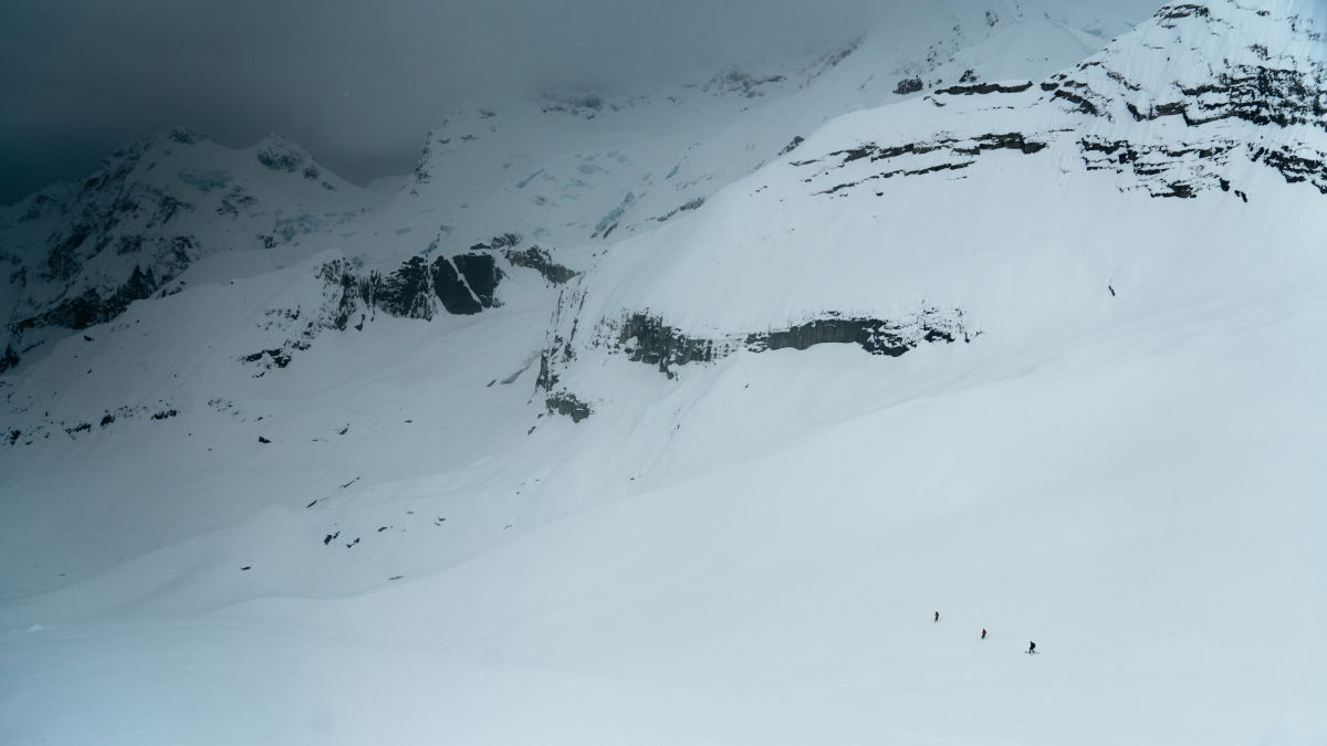 Following a quick lunch at Ice Pass, we pushed up the shoulder of Alien Peak to link the Zen pocket glacier with Home Run. Massive cornices loomed overhead, so we spaced out and skied the exposed 100-meter section as quickly as possible. After crossing a flat spot with a quick tow from Ben and some awkward butt-scooching, we hit the final pitch. We spread out across the face, farming fresh powder all the way back to the lodge.