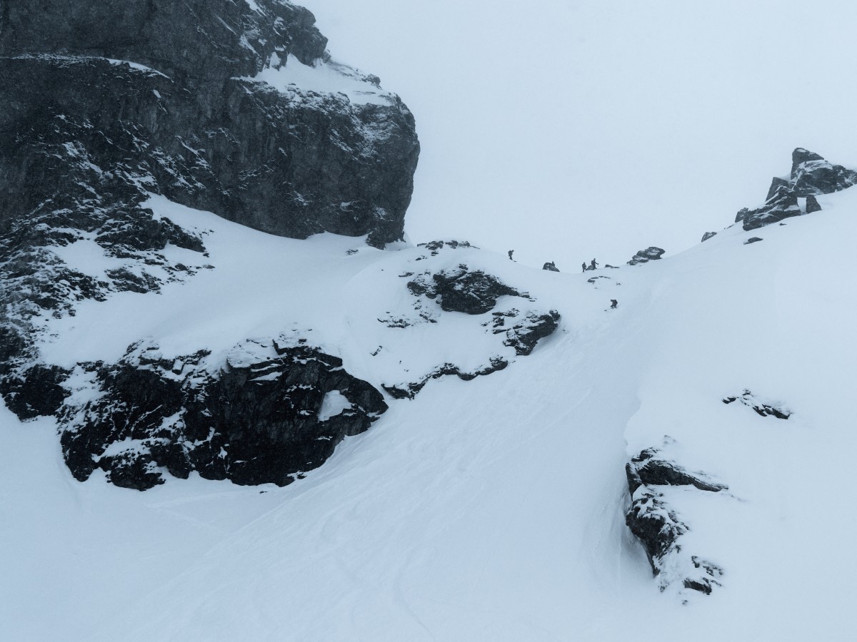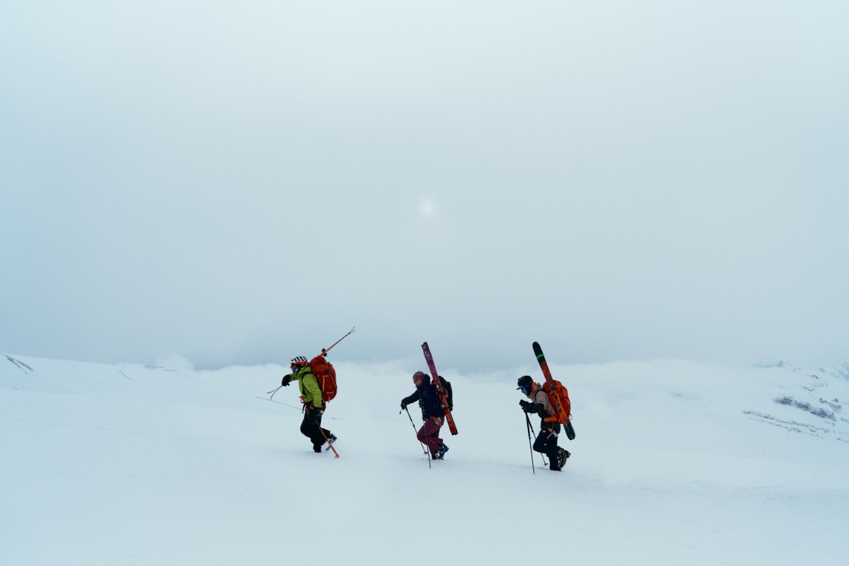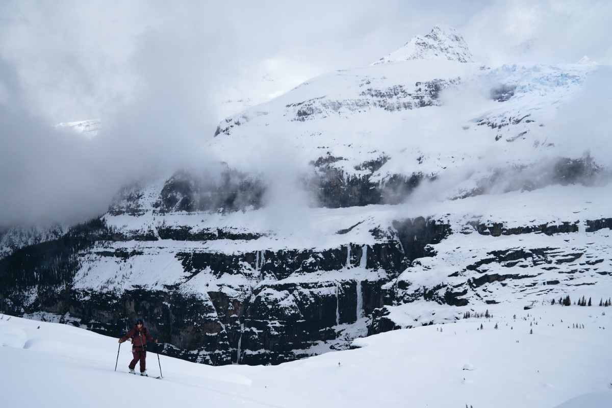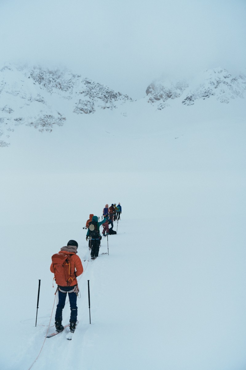 Outside the hut, we threw on our skins and harnesses and prepared to head north. Within minutes of skinning, Ali vanished as he unknowingly walked off a wind lip. A thick pea soup had swallowed the landscape while Ali tied some rope to the end of his pole and began slowly fishing our way down. He joked that old ACMG whiteout training on sunny days involved smearing vaseline over their glasses and attempting to navigate their destination. GPS has thankfully made modern whiteout navigation much safer. What should have been a quick pitch turned into an hour before it cleared enough to rip skins and pick our way down a wide gully.