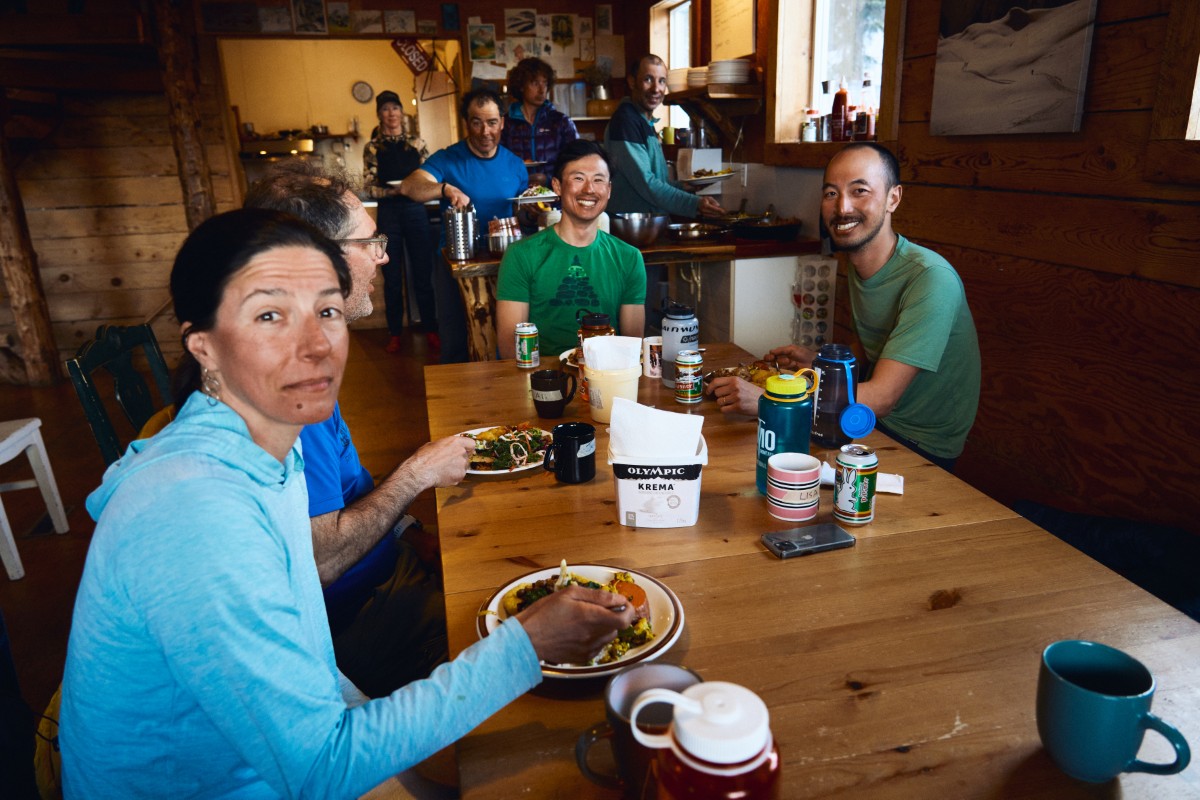 The sun finally peeked out through the clouds as we navigated the last rolling gullies towards Icefall Lodge. By the time we pulled in, I was mid-bonk and running entirely on peanut M&M fumes. After getting settled into the group's two-story cabin and splitting a bunk with Ben, we headed down to the sauna to thaw out. Ben and I relaxed in the near-pitch black as he shared a story where the same dim lighting accidentally caused a girl to sit between the legs of a stark-naked guy last year. Overheating and dripping with sweat, I fumbled my way out of the dark and took my first shower from a watering can. The ceiling hook was so high Shane joked he didn't know he needed to pack a stick clip to wash up. I hung his can for him and rallied at the lodge for dinner with the rest of the crew.