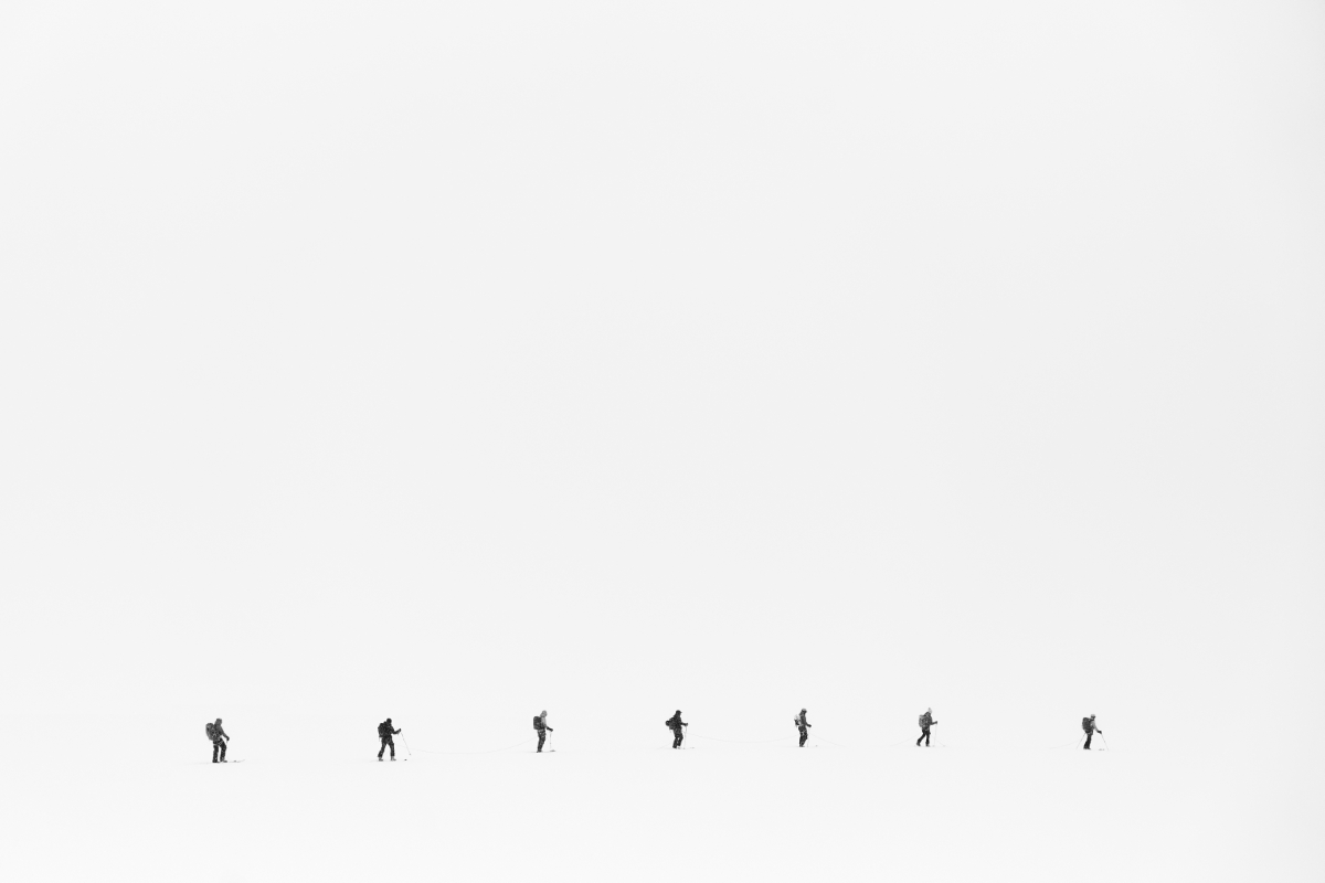 Going into the trip, I was mentally prepared for tight survival skiing and some degree of split-skiing. What I didn’t anticipate was the unique misery of doing it while roped up. I hung back on the shorter rope with Ben and Shasta (whom Ben inexplicably dubbed 'Team Ramrod') while the other seven clipped into the adventure version of a kid's walking rope. I hadn't even finished shouldering my pack when Shane went flying backward in a flurry of expletives, yanked clean off his feet by the momentum of his group. I think it's safe to say no-one enjoys skiing on a tether.